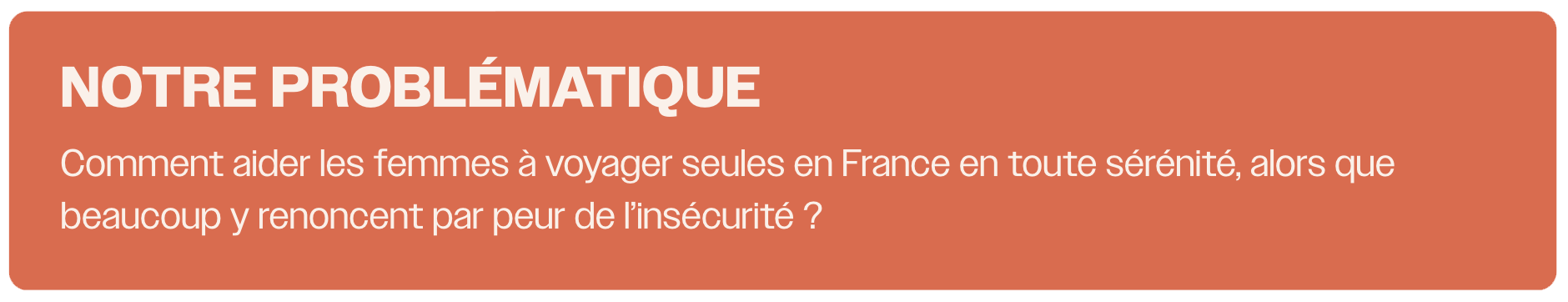 Nous avons choisi de travailler sur cette problématique car elle répond à une tension réelle et encore trop peu adressée : de plus en plus de femmes voyagent seules, mais ce choix reste profondément conditionné par une peur omniprésente celle de l'insécurité.
